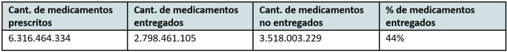 Solo 44% de los medicamentos prescritos fueron efectivamente entregados en los establecimientos de salud. Esto implica que apenas cuatro de cada diez medicamentos recetados llegaron a los pacientes, obligando a que los restantes sean adquiridos en boticas y farmacias privadas, un mercado altamente concentrado; o que la gente que no pueda comprarlos se quede sin tratamientos.